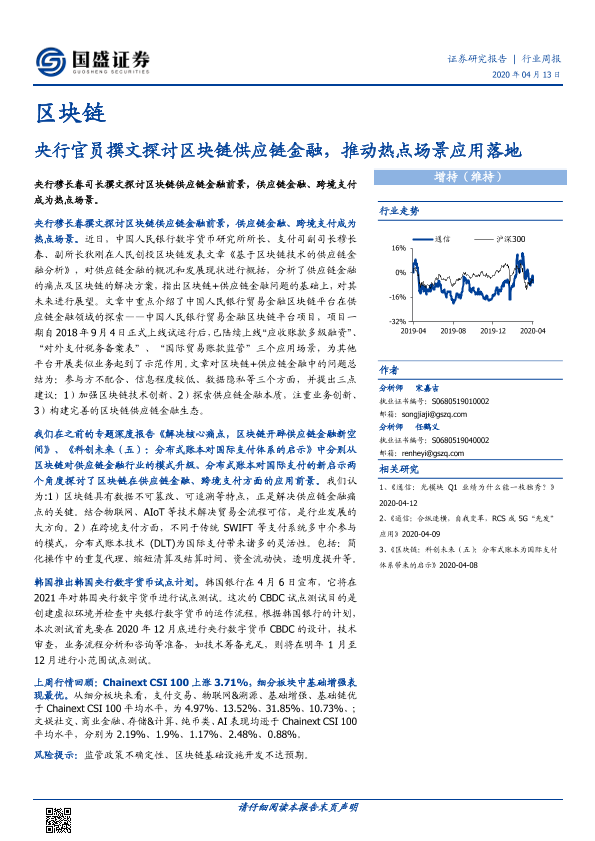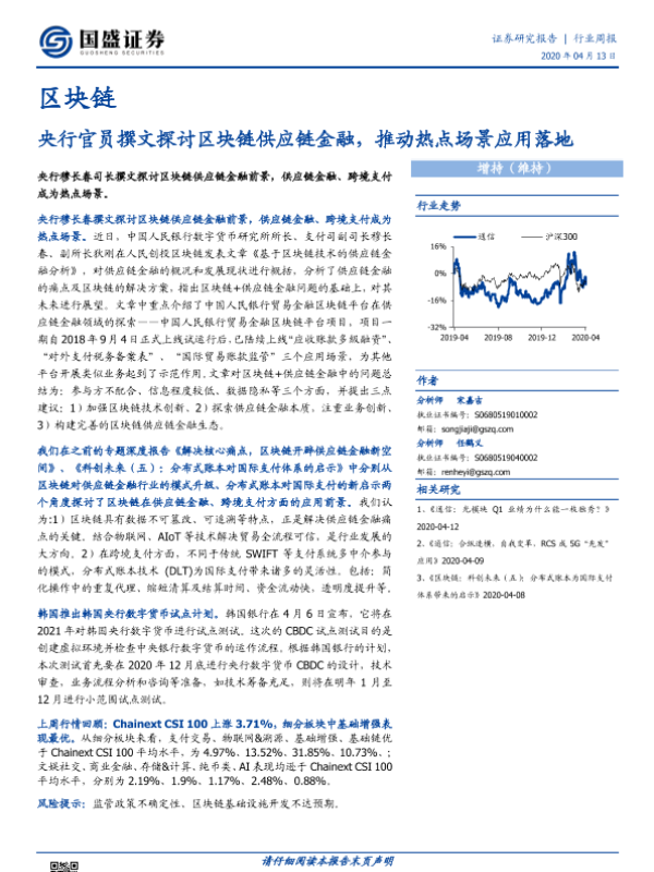 【国盛证券】【20200413】20200413-国盛证券-区块链行业周报:央行官员撰文探讨区块链供应链金融,推动热点场景应用落地-8页