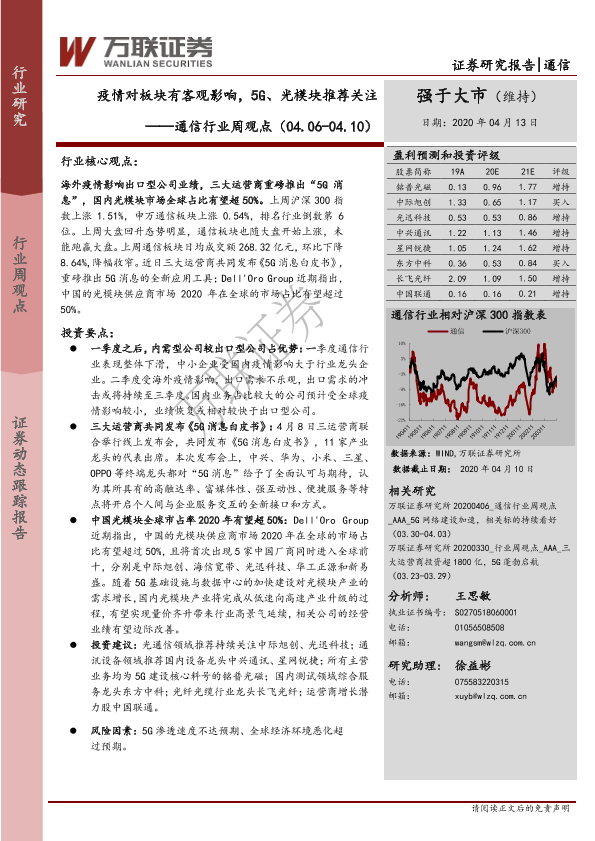 【万联证券】【20200413】20200413-万联证券-通信行业周观点:疫情对板块有客观影响,5G、光模块推荐关注-14页