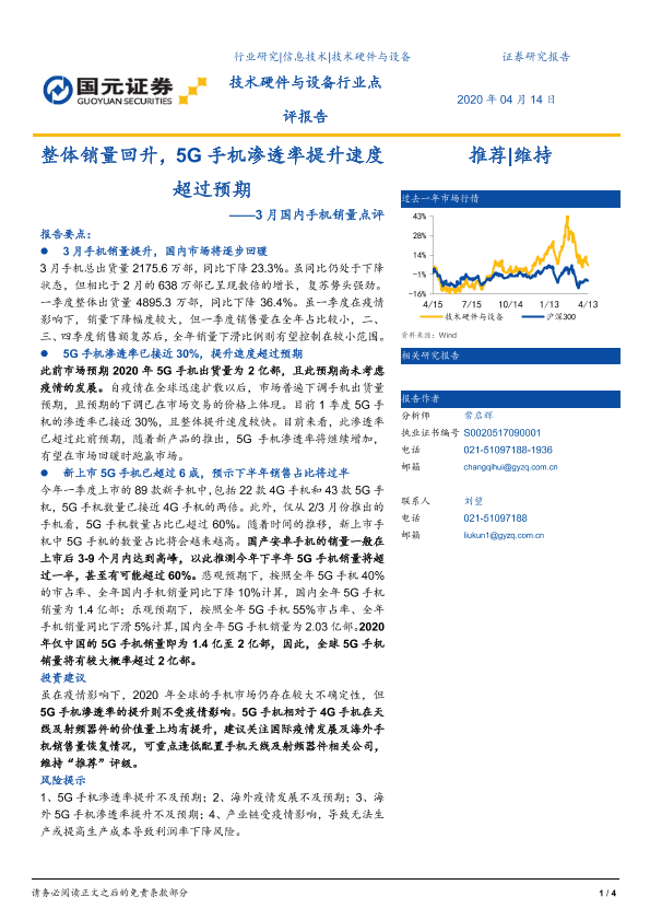 【国元证券】【20200414】3月国内手机销量点评:整体销量回升,5G手机渗透率提升速度超过预期-4页