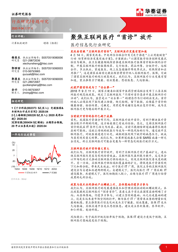 【华泰证券】【20200417】医疗信息化行业研究:聚焦互联网医疗“首诊”放开-8页