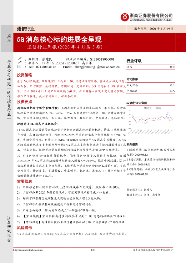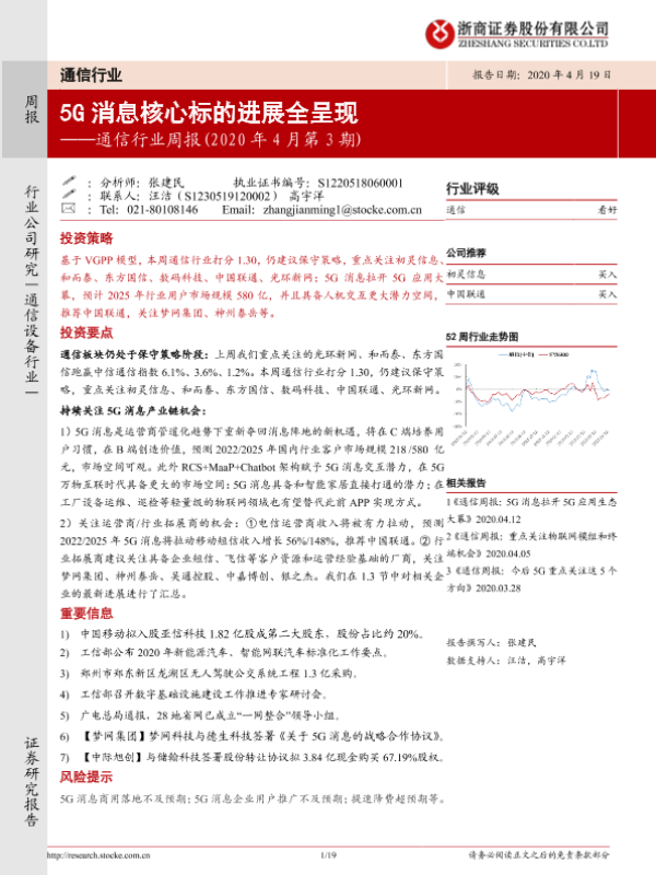 【浙商证券】【20200419】20200419-浙商证券-通信行业周报(投资策略2020年4月第3期):5G消息核心标的进展全呈现-19页