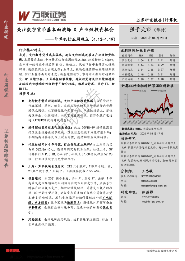 【万联证券】【20200420】计算机行业周观点:关注数字货币基本面演绎&产业链投资机会-16页