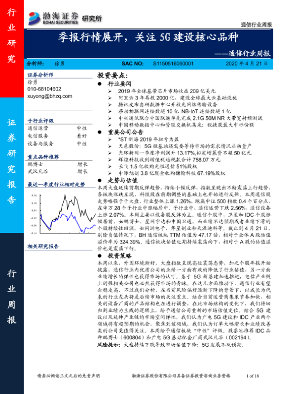 【渤海证券】【20200421】通信行业周报:季报行情展开,关注5G建设核心品种-18页