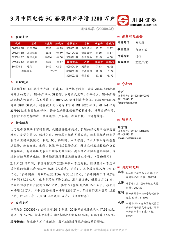 【川财证券】【20200423】3月中国电信5G套餐用户净增1200万户-2页