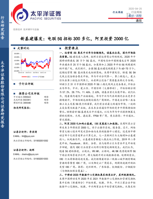 【太平洋证券】【20200425】通信行业周报:新基建爆发:电联5G招标300多亿,阿里投资2000亿-12页