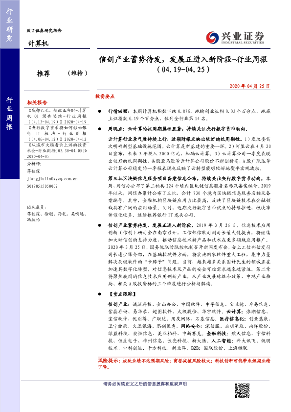 【兴业证券】【20200425】计算机行业周报:信创产业蓄势待发,发展正进入新阶段-22页