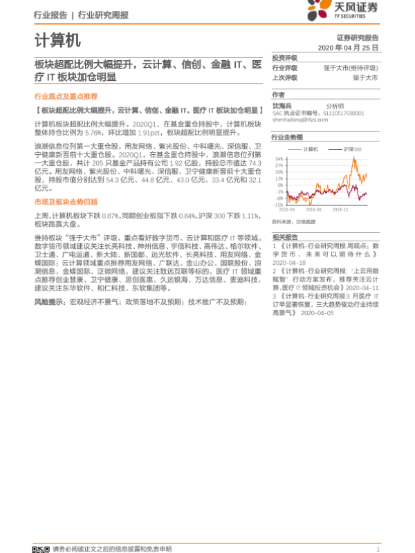 【天风证券】【20200425】计算机行业研究周报:板块超配比例大幅提升,云计算、信创、金融IT、医疗IT板块加仓明显-11页