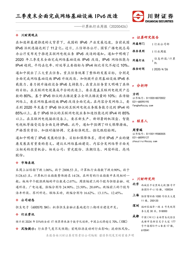 【川财证券】【20200426】20200426-川财证券-计算机行业周报:三季度末全面完成网络基础设施IPv6改造-10页
