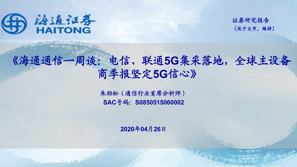 【海通证券】【20200426】海通通信一周谈:电信、联通5G集采落地,全球主设备商季报坚定5G信心-10页