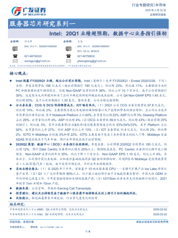 【广发证券】【20200426】Intel:20Q1业绩超预期,数据中心业务指引强劲-8页