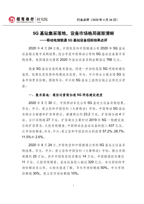 【招商银行】【20200426】移动电信联通5G基站设备招标结果点评:5G基站集采落地,设备市场格局逐渐清晰-3页