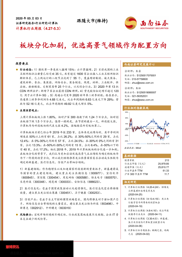 【西南证券】【20200503】计算机行业周报:板块分化加剧,优选高景气领域作为配置方向-21页