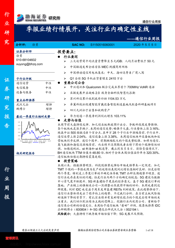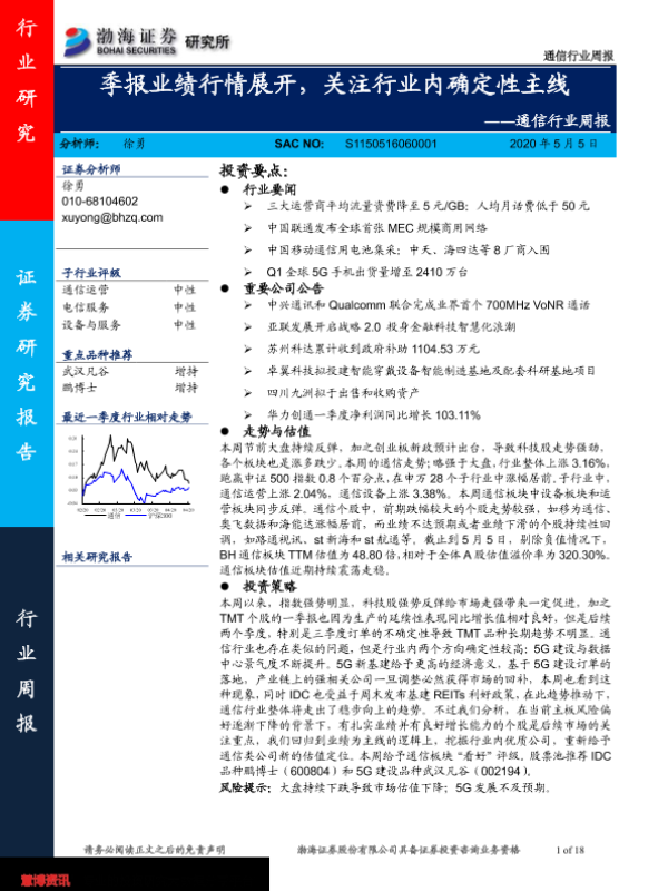 【渤海证券】【20200505】通信行业周报:季报业绩行情展开,关注行业内确定性主线-18页