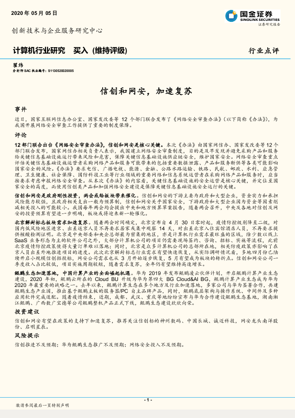 【国金证券】【20200505】计算机行业研究:信创和网安,加速复苏-3页