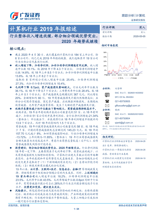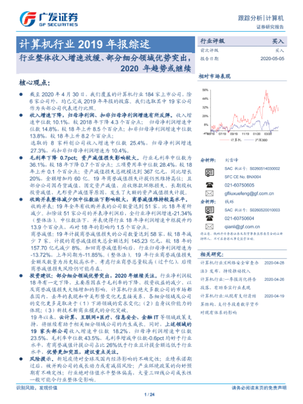 【广发证券】【20200505】计算机行业2019年报综述:行业整体收入增速放缓、部分细分领域优势突出,2020年趋势或继续-24页
