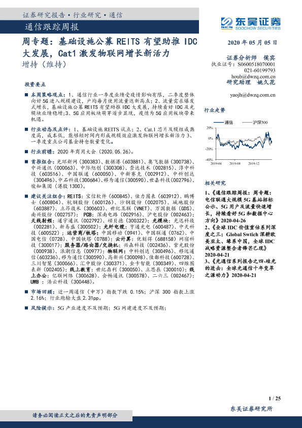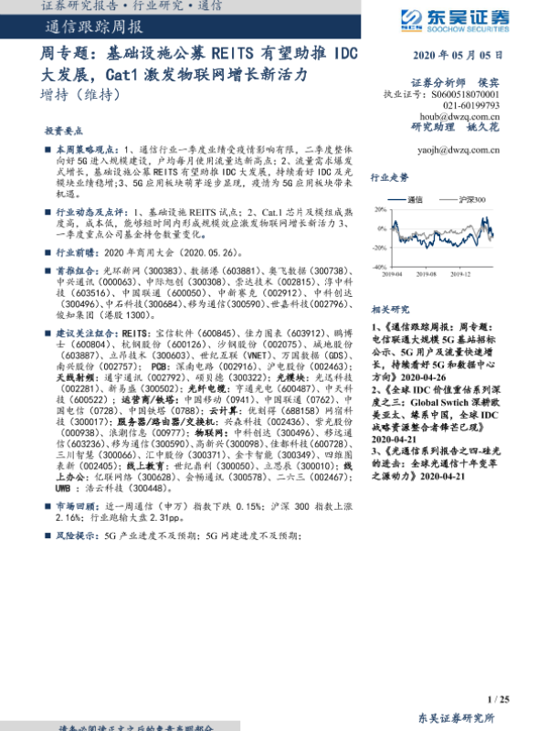 【东吴证券】【20200505】通信跟踪周报:周专题:基础设施公募REITS有望助推IDC大发展,Cat1激发物联网增长新活力-25页
