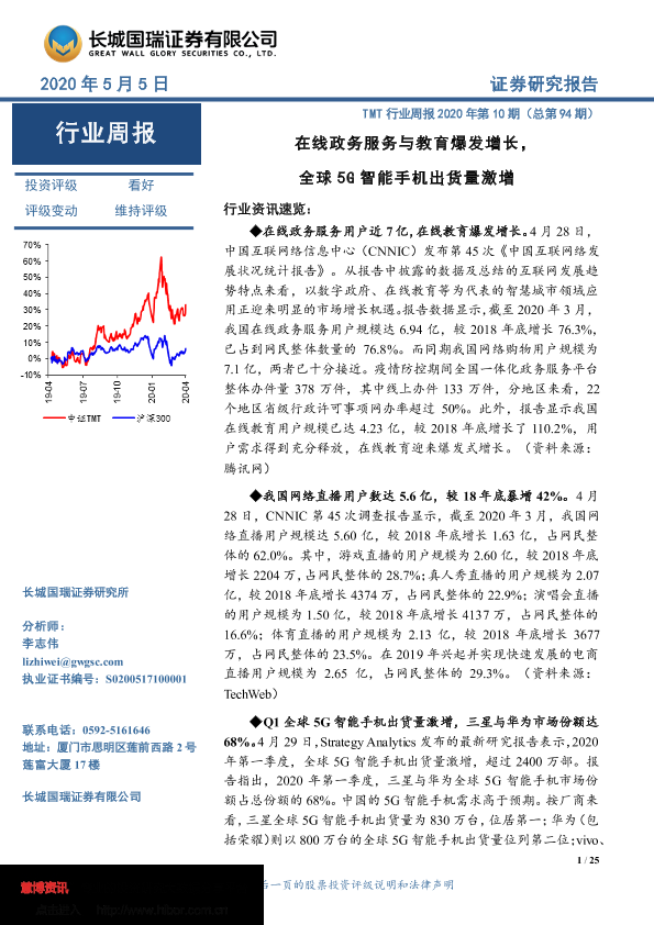 【长城国瑞证券】【20200505】TMT行业周报2020年第10期(总第94期):在线政务服务与教育爆发增长,全球5G智能手机出货量激增-25页