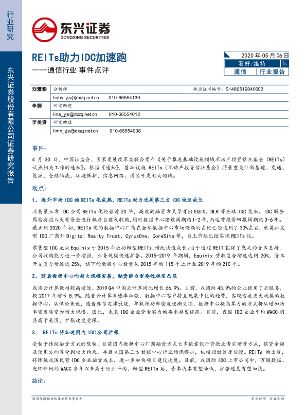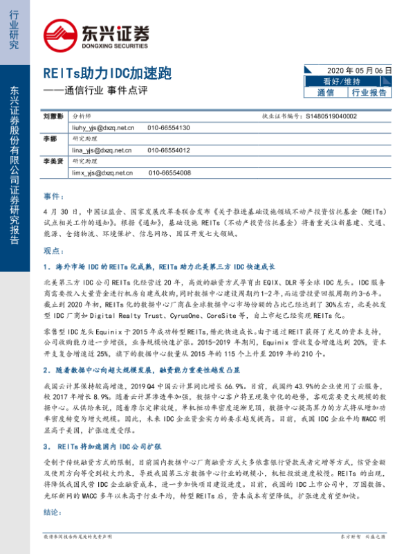 【东兴证券】【20200506】通信行业事件点评:REITs助力IDC加速跑-4页