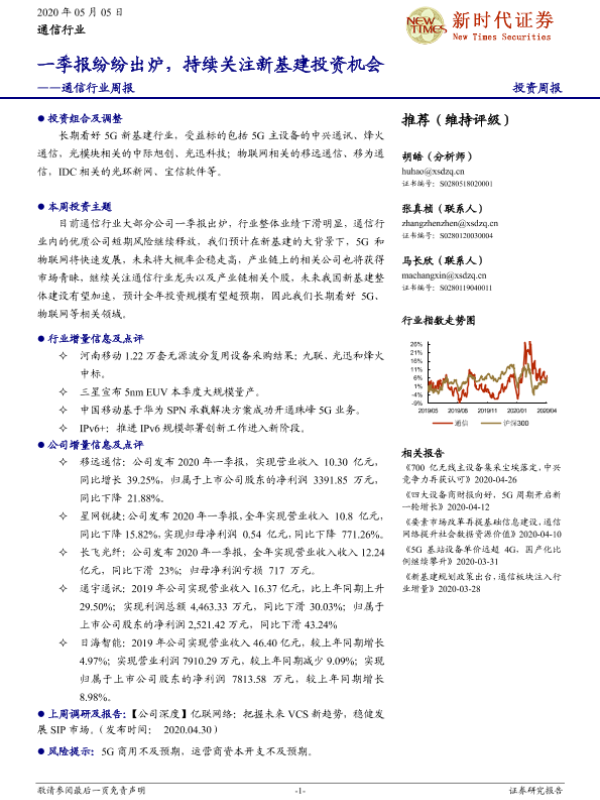 【新时代证券】【20200505】通信行业周报:一季报纷纷出炉,持续关注新基建投资机会-17页