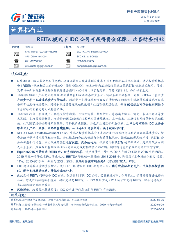 【广发证券】【20200506】REITs模式下IDC公司可获得资金保障,改善财务指标-10页
