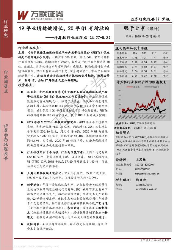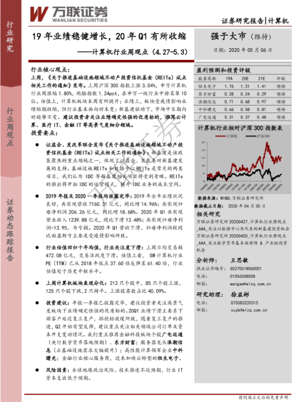 【万联证券】【20200506】20200506-万联证券-计算机行业周观点:19年业绩稳健增长,20年Q1有所收缩-12页