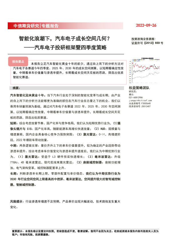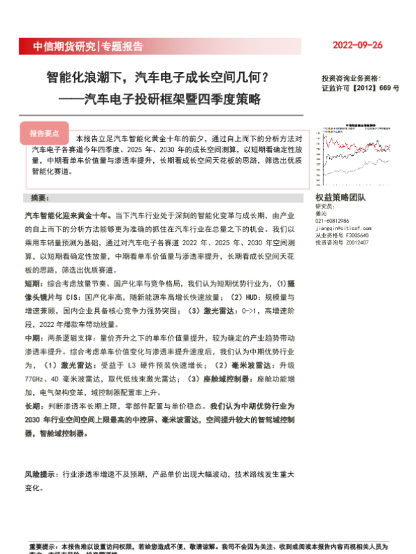 【中信期货】【20220926】专题报告:汽车电子投研框架暨四季度策略,智能化浪潮下,汽车电子成长空间几何?-16页