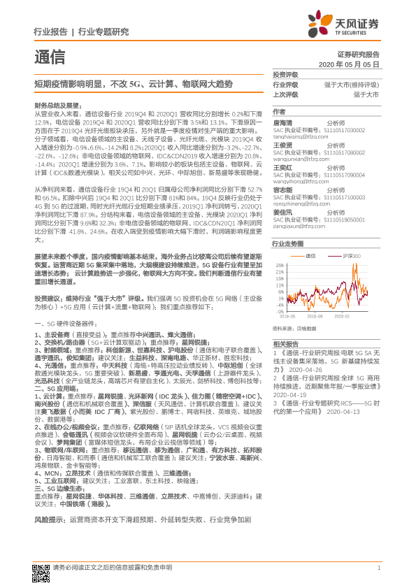 【天风证券】【20200505】通信行业专题研究:短期疫情影响明显,不改5G、云计算、物联网大趋势-36页