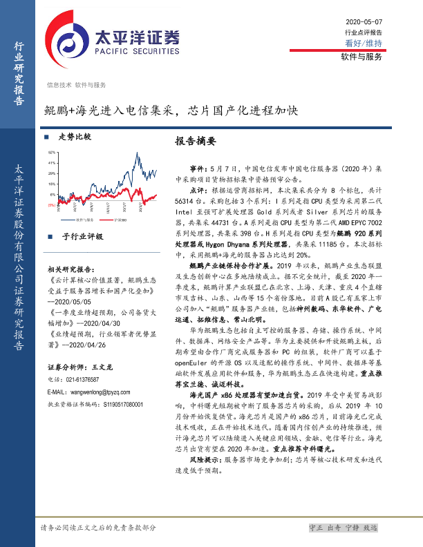 【太平洋证券】【20200507】软件与服务行业点评报告:鲲鹏+海光进入电信集采,芯片国产化进程加快-3页