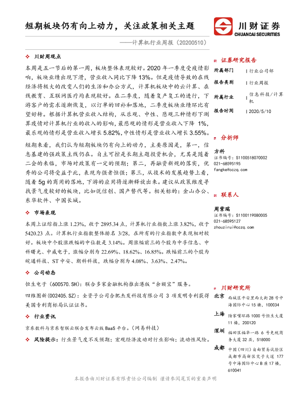 【川财证券】【20200510】计算机行业周报:短期板块仍有向上动力,关注政策相关主题-10页
