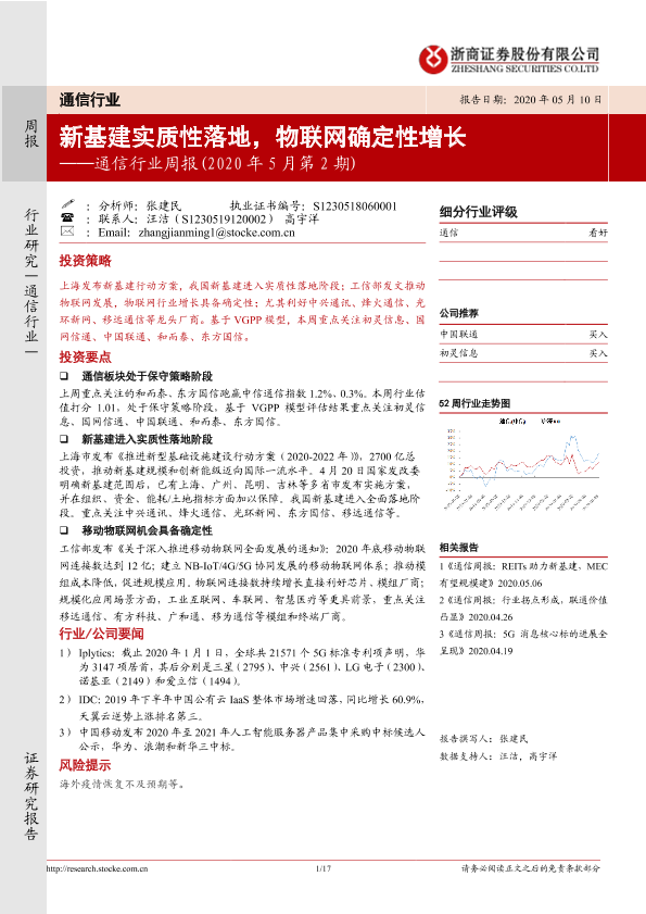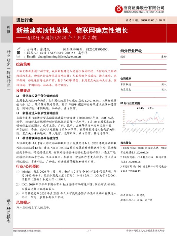 【浙商证券】【20200510】20200510-浙商证券-通信行业周报(2020年5月第2期):新基建实质性落地,物联网确定性增长-17页