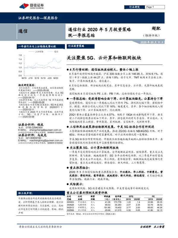 【国信证券】【20200511】通信行业2020年5月投资策略既一季报总结:关注聚焦5G、云计算和物联网板块-13页