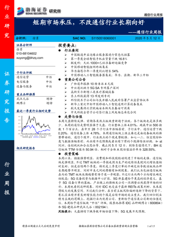 【渤海证券】【20200512】20200512-渤海证券-通信行业周报:短期市场承压,不改通信行业长期向好-15页