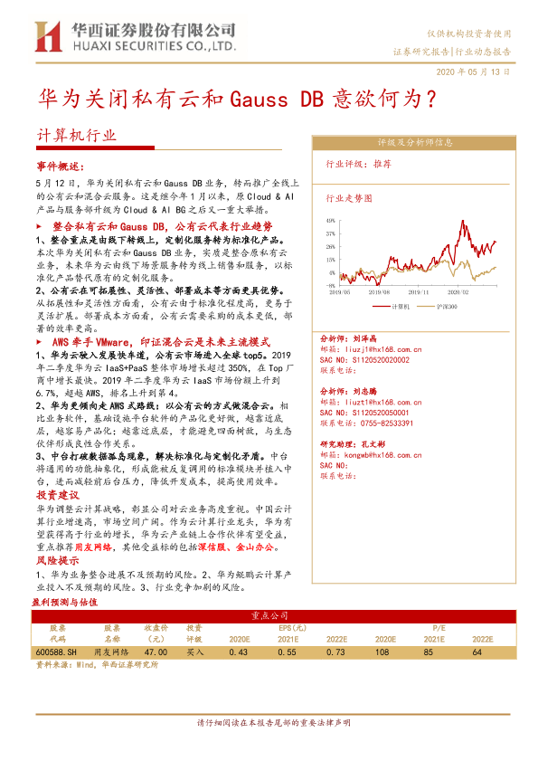 【华西证券】【20200513】计算机行业:华为关闭私有云和Gauss DB意欲何为?-13页