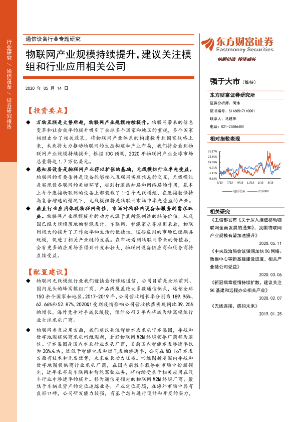 【东方财富证券】【20200514】通信设备行业专题研究:物联网产业规模持续提升,建议关注模组和行业应用相关公司-27页