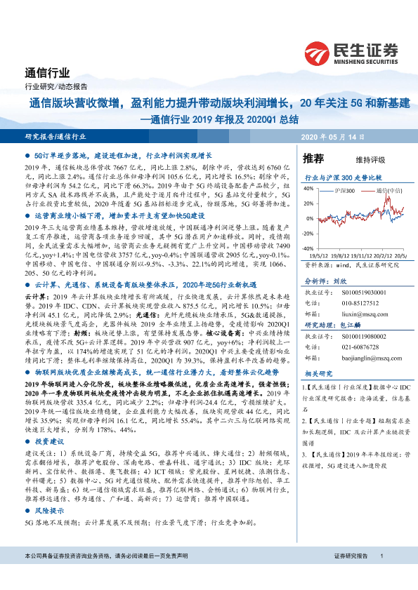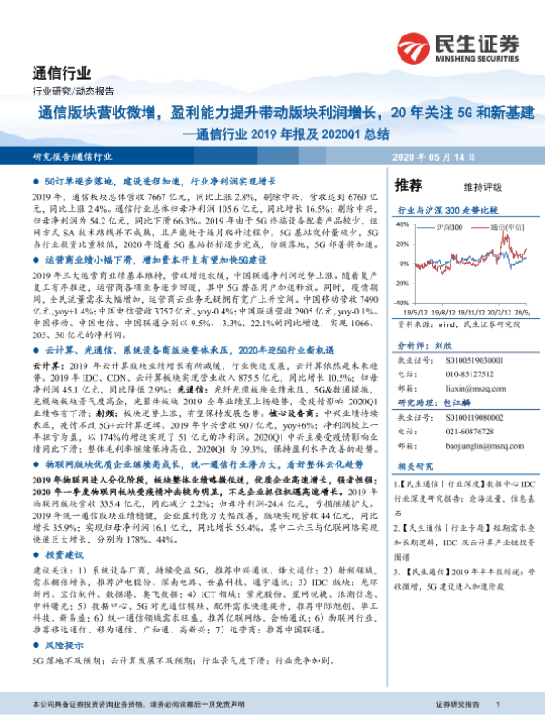 【民生证券】【20200514】通信行业2019年报及2020Q1总结:通信版块营收微增,盈利能力提升带动版块利润增长,20年关注5G和新基建-18页