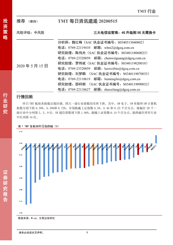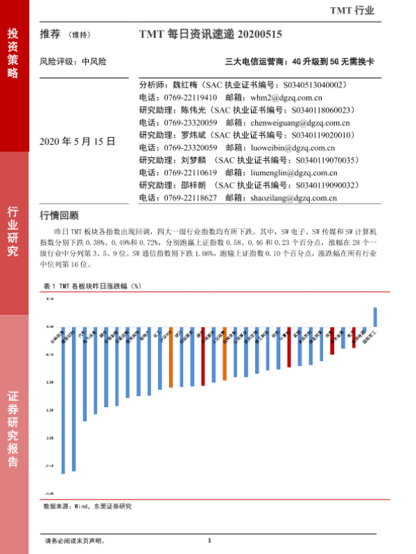 【东莞证券】【20200515】TMT每日资讯速递:三大电信运营商:4G升级到5G无需换卡-4页