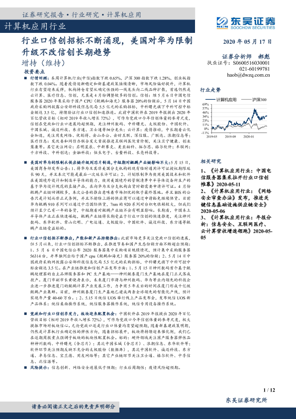 【东吴证券】【20200517】计算机应用行业:行业口信创招标不断涌现,美国对华为限制升级不改信创长期趋势-12页
