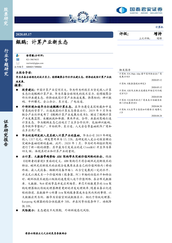 【国泰君安证券】【20200517】鲲鹏:计算产业新生态-14页