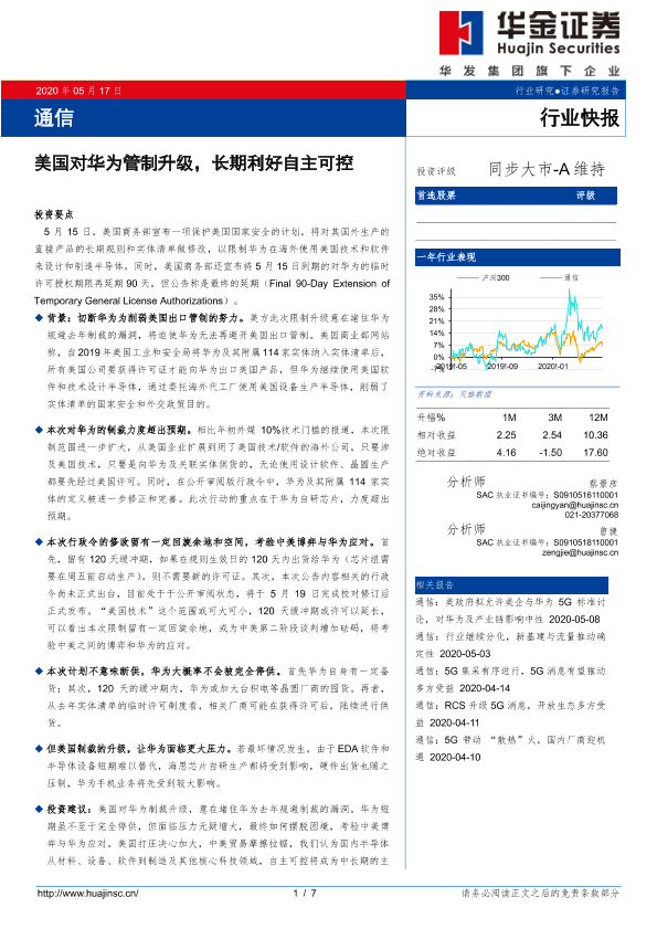 【华金证券】【20200517】通信行业快报:美国对华为管制升级,长期利好自主可控-7页