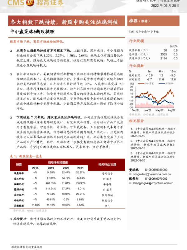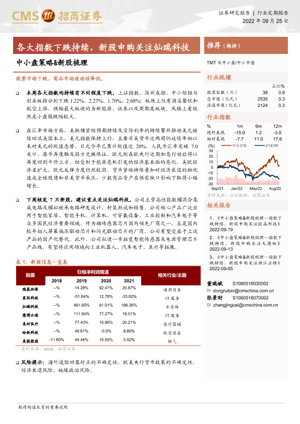 【海通证券】【20220925】中小盘策略&新股梳理:各大指数下跌持续,新股申购关注灿瑞科技-17页