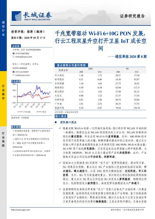 【长城证券】【20200517】通信周报2020第8期:千兆宽带驱动Wi-Fi6+10G PON发展,行云工程双星升空打开卫星IoT成长空间-21页