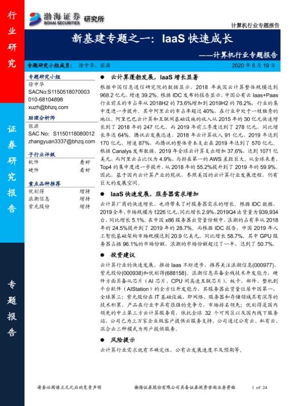 【渤海证券】【20200519】新基建专题之一:IaaS快速成长-24页