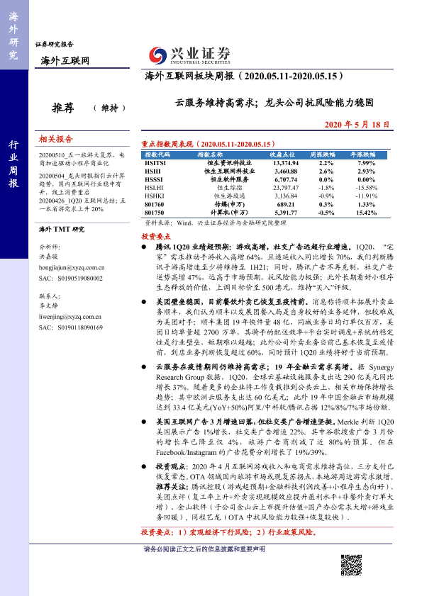 【兴业证券】【20200518】海外互联网板块周报:云服务维持高需求;龙头公司抗风险能力稳固-22页