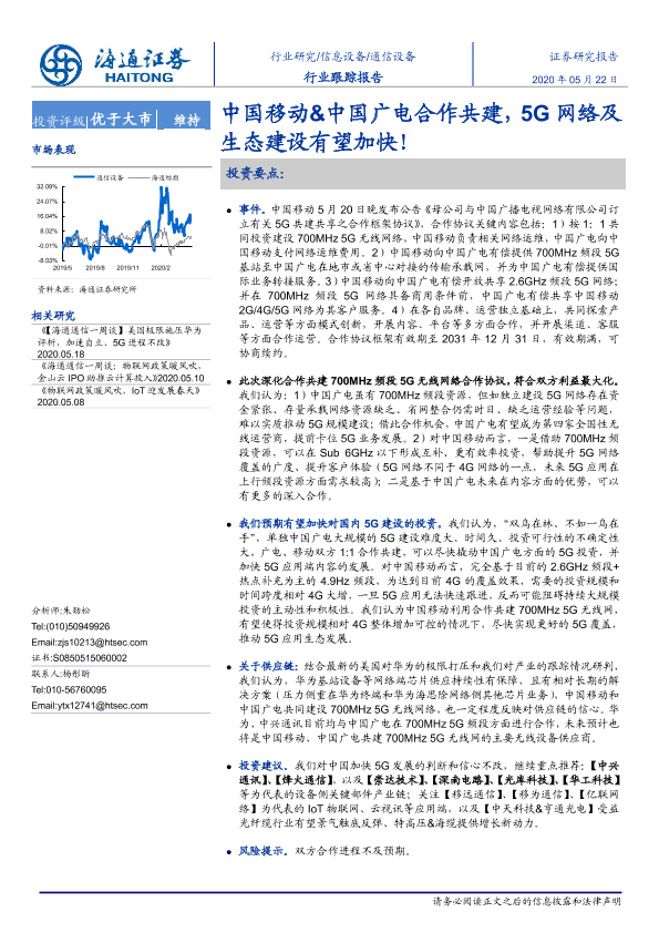 【海通证券】【20200522】中国移动&中国广电合作共建,5G网络及生态建设有望加快!-3页