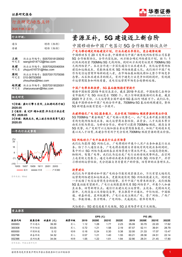 【华泰证券】【20200522】通信动态点评:中国移动和中国广电签订5G合作框架协议点评-资源互补,5G建设迈上新台阶-9页