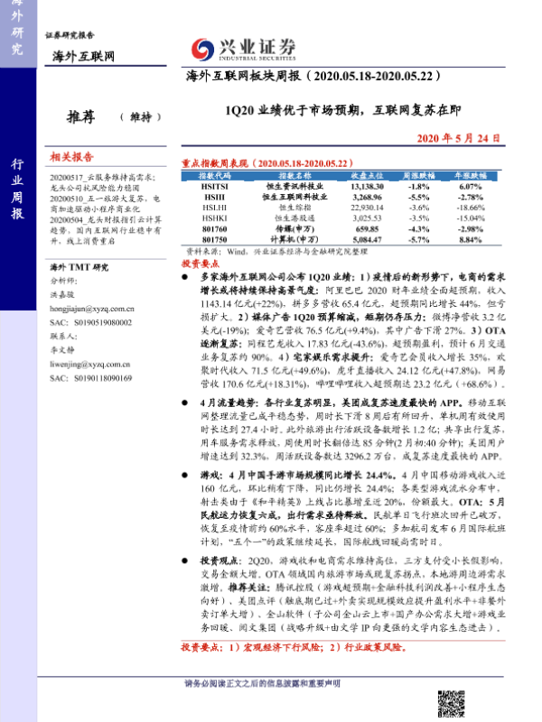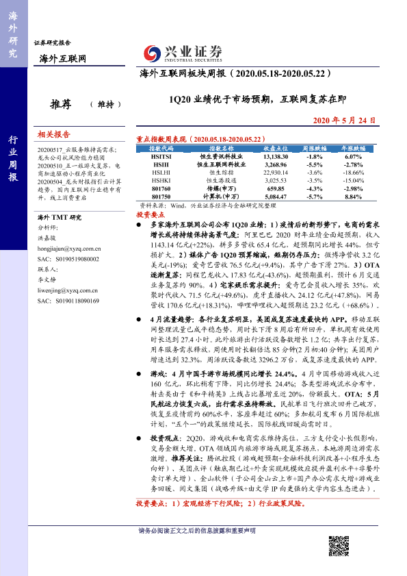 【兴业证券】【20200524】海外互联网板块周报:1Q20业绩优于市场预期,互联网复苏在即-23页
