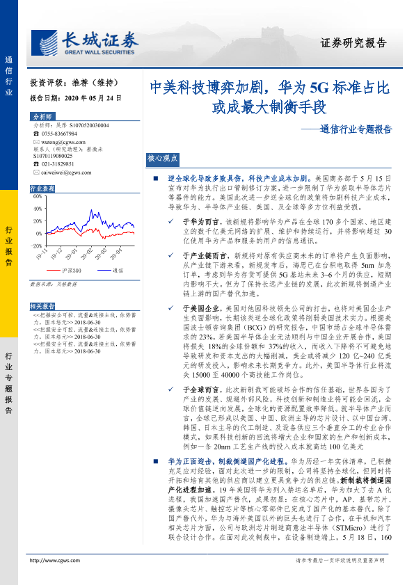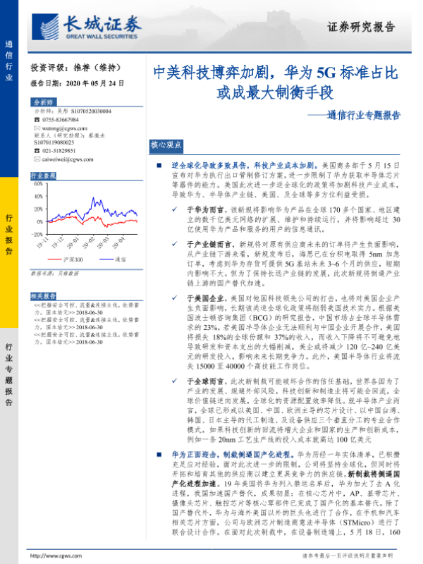 【长城证券】【20200524】通信行业专题报告:中美科技博弈加剧,华为5G标准占比或成最大制衡手段-15页
