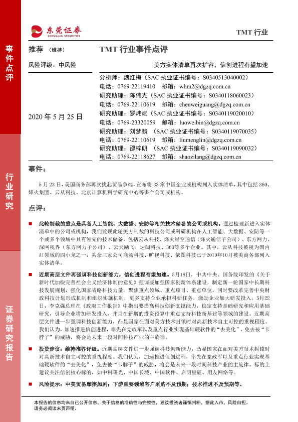 【东莞证券】【20200525】TMT行业事件点评:美方实体清单再次扩容,信创进程有望加速-2页