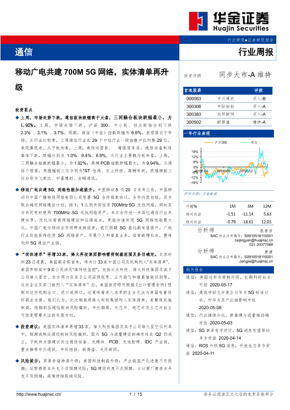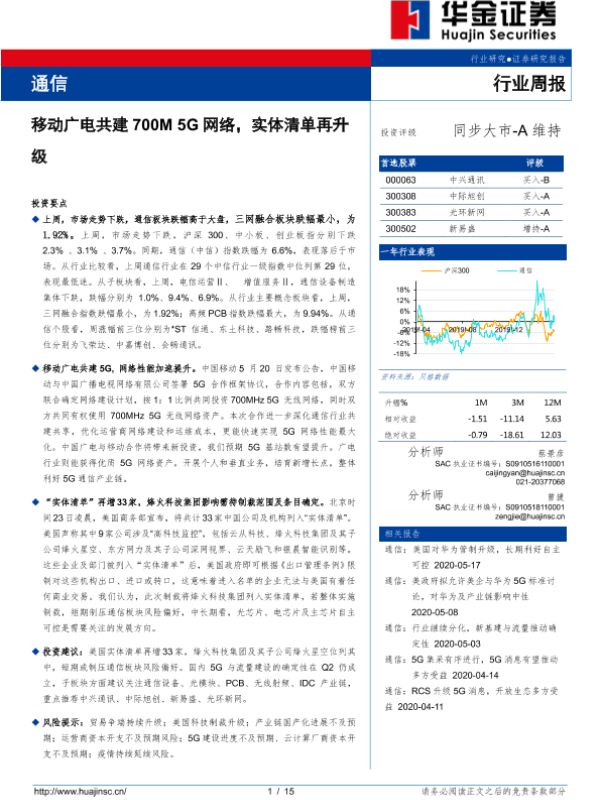 【华金证券】【20200525】通信行业周报:移动广电共建700M 5G网络,实体清单再升级-15页