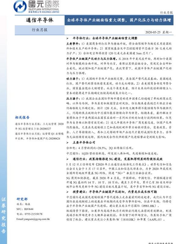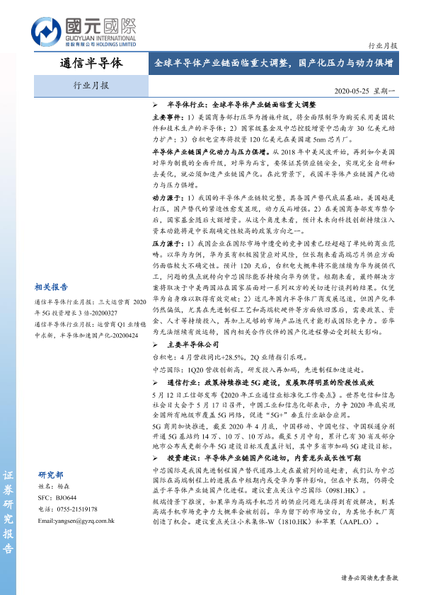 【国元国际】【20200525】通信半导体行业月报:全球半导体产业链面临重大调整,国产化压力与动力俱增-10页